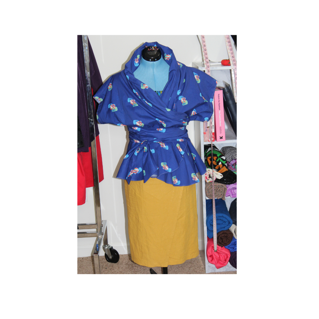 I cut the shoulders and trimmed most of the pieces to match the edges. First, I sewed the shoulders and center facing. Second, I sewed the side seams together with the ties in the middle. I set them off angle because I made the ties super long in order to overlap and go around my waist a couple times. I did not add the button on the inside because there was excess fabric I didn’t know what to do with.